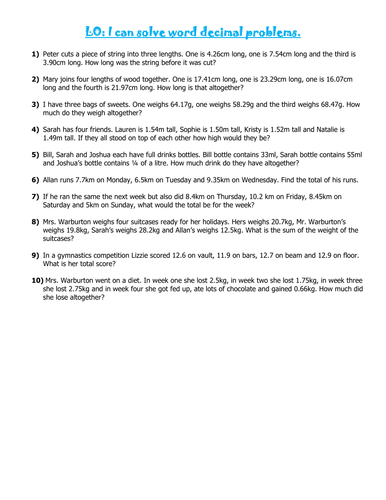 Below are six versions of our grade 6 math worksheet on addition of decimals. This worksheet contains word problems invovling decimals. Horizontally arranged adding and subtracting decimals worksheets Adding and subtracting decimals is fairly straightforward when all the decimals are lined up.